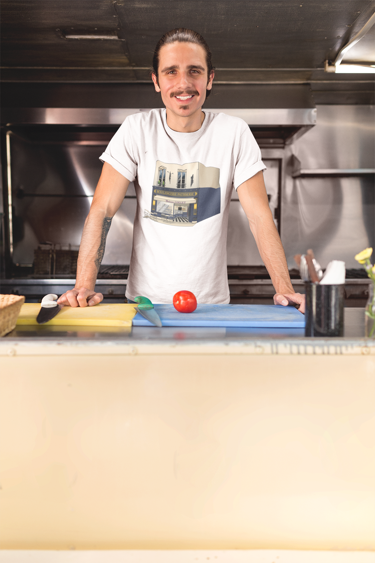 Let us cartoon your cafe, restaurant, bar, food truck, or special character and print it on Add 100% cotton t-shirts for your team and customers. Perfect for teamwear, promotional merch, or special events! Our t-shirt and design package includes: